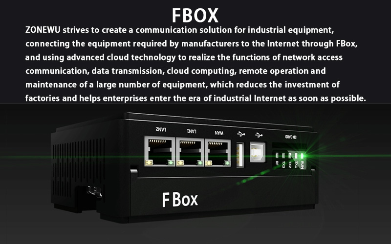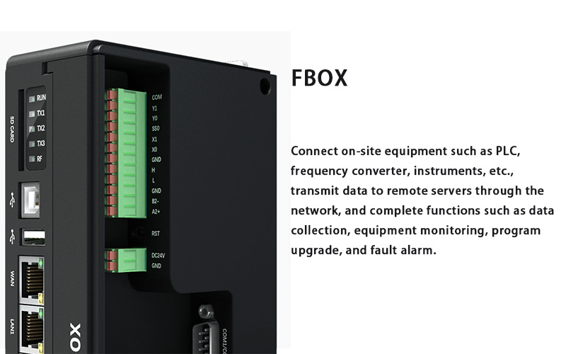 FBOX ialah terminal pemerolehan data pintar medan dalam platform IoT Perindustrian, yang membolehkan pengumpulan data jarak jauh, muat turun dan penyelenggaraan peralatan di tapak dengan mudah. Menyokong lebih 350 protokol pemacu peranti perindustrian dan pelbagai antara muka komunikasi, ia memenuhi keperluan rangkaian untuk kebanyakan pengawal perindustrian. Sistem ini menyokong pelbagai kaedah akses internet dan pelayan awan. Fungsi konfigurasi, diagnostik dan pengurusan jarak jauh boleh dilaksanakan secara langsung melalui platform pengurusan jarak jauh.