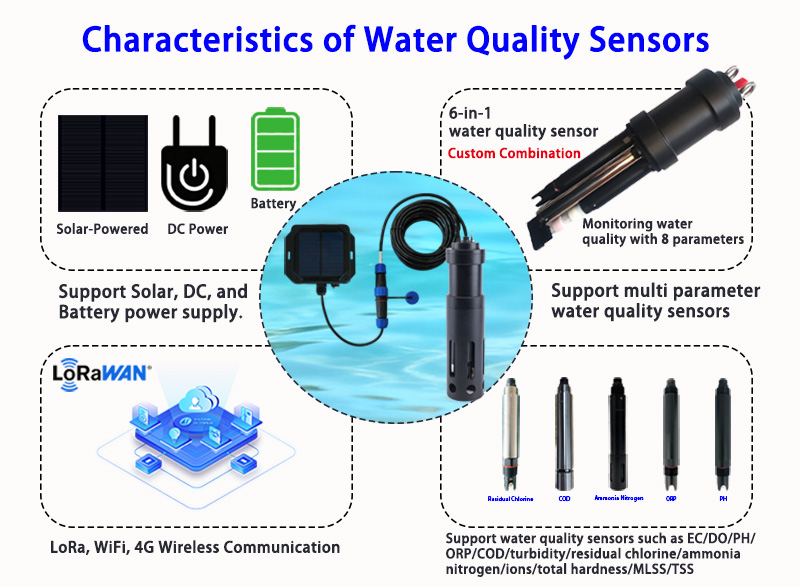 Penderia berbilang parameter kualiti air suria LoRaWAN ialah penderia wayarles yang digunakan untuk memantau berbilang parameter kualiti air. COD oksigen terlarut pilihan、 Kekonduksian/ kemasinan, kekeruhan, ammonia nitrogen pH、ORP、 Ionik, kekerasan air, klorofil, alga biru-hijau dan penderia kualiti air digital lain sesuai untuk pemantauan dalam talian jangka panjang.